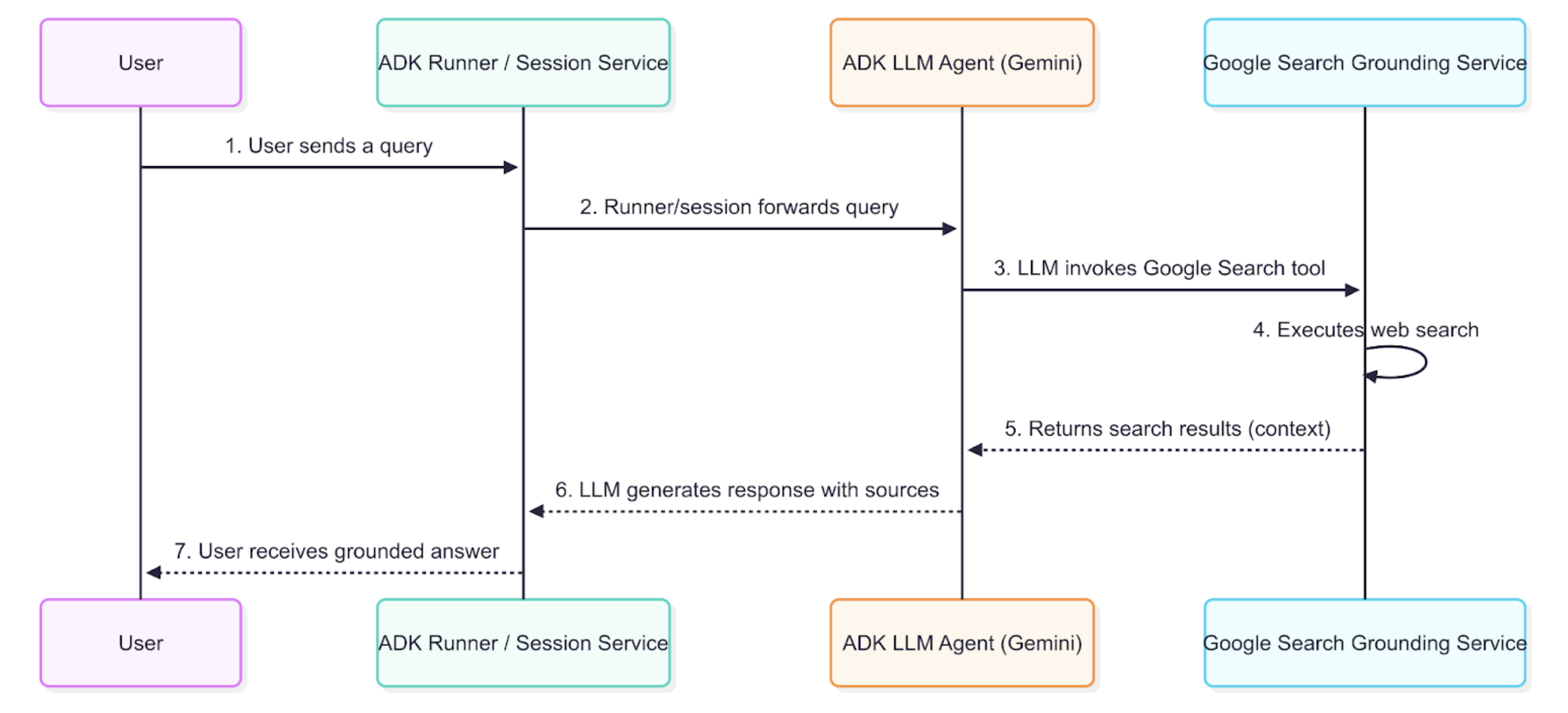 7. Response Presentation with Sources: The ADK receives the final grounded response, which includes the necessary source URLs and groundingMetadata, and presents it to the user with attribution. This allows end-users to verify the information and builds trust in the agent's answers.